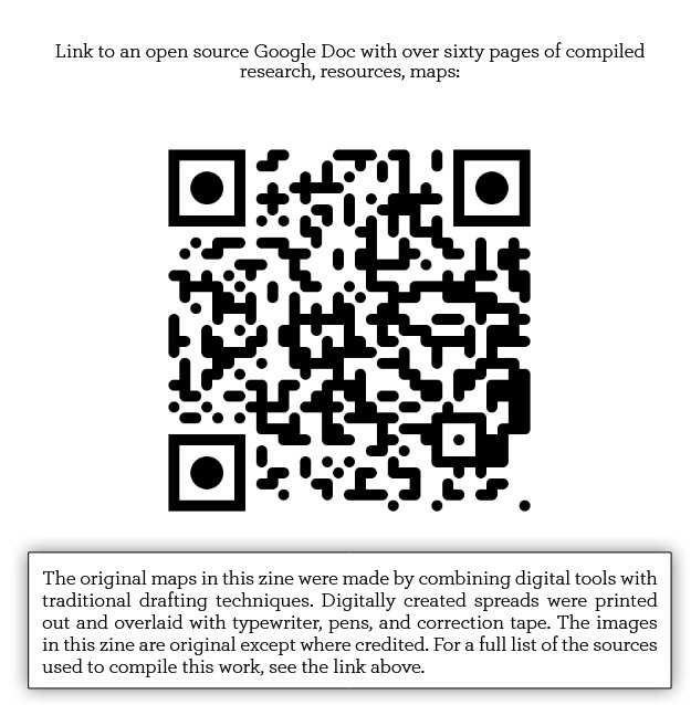 The original maps in this zine were made by combining digital tools with traditional drafting techniques. Digitally created spreads were printed out and overlaid with typewriter, pens, and correction tape. The images in this zine are original except where credited. For a full list of the sources used to compile this work, see the Google Doc linked above.