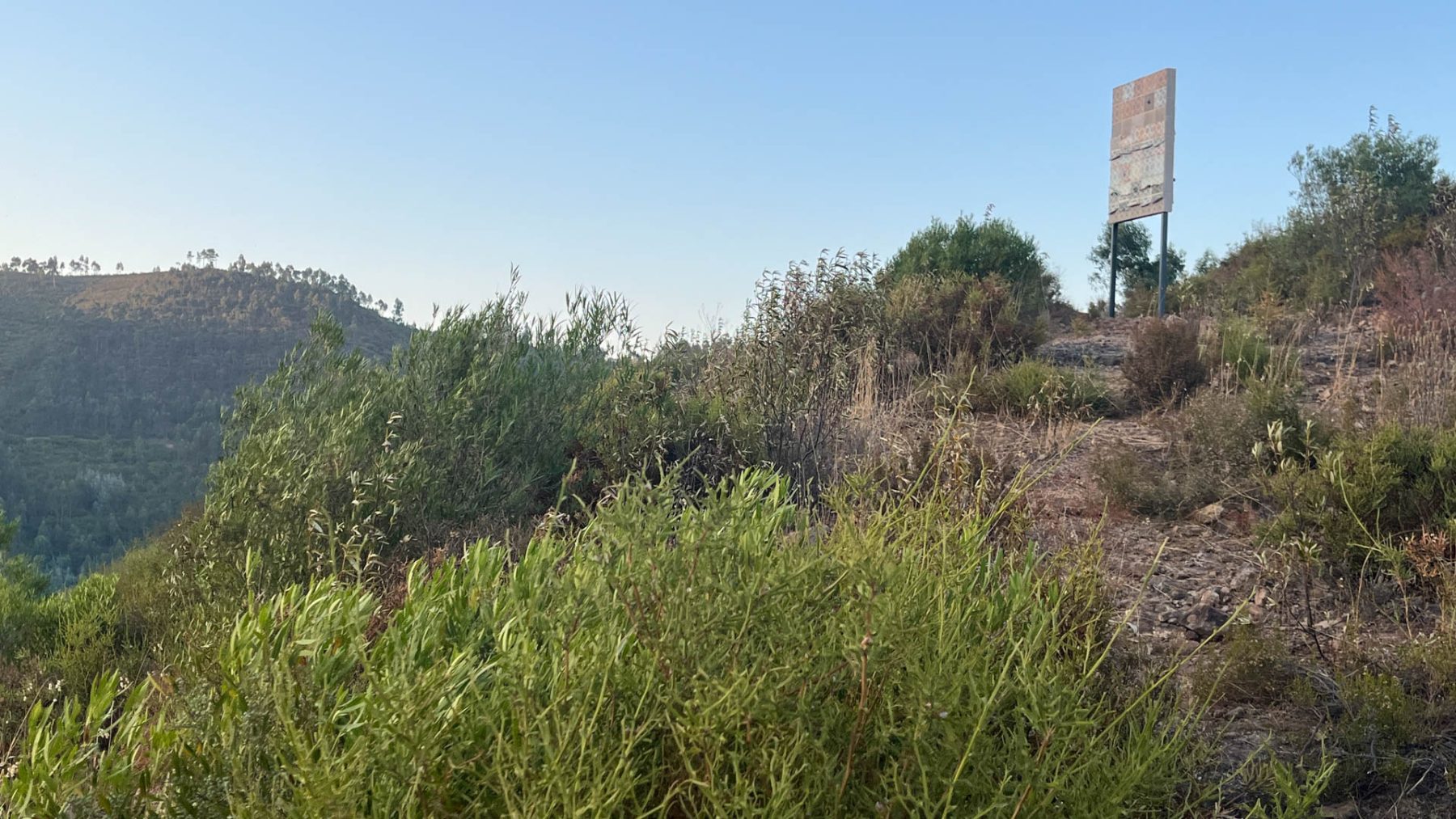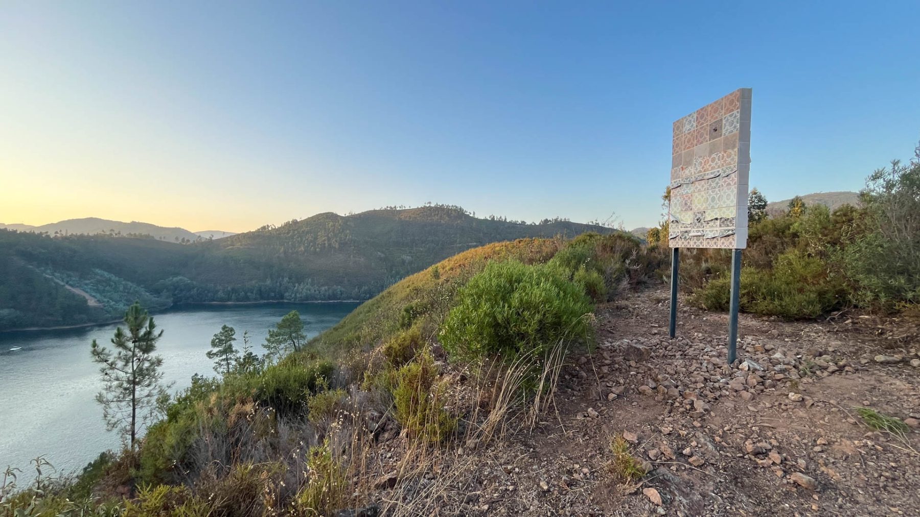 This slab was installed on a recently burned hillside alongside the Zêzere river in the Santarém District of central Portugal. The hillside is covered in fragrant Rock Rose bushes (“Esteva” in Portuguese), and one of the first to emerge in this region after fire activity. Unlike California, here in the Portugal hills, we are within the native range of Esteva, grounding this site with the essence of an ancestral homeland.