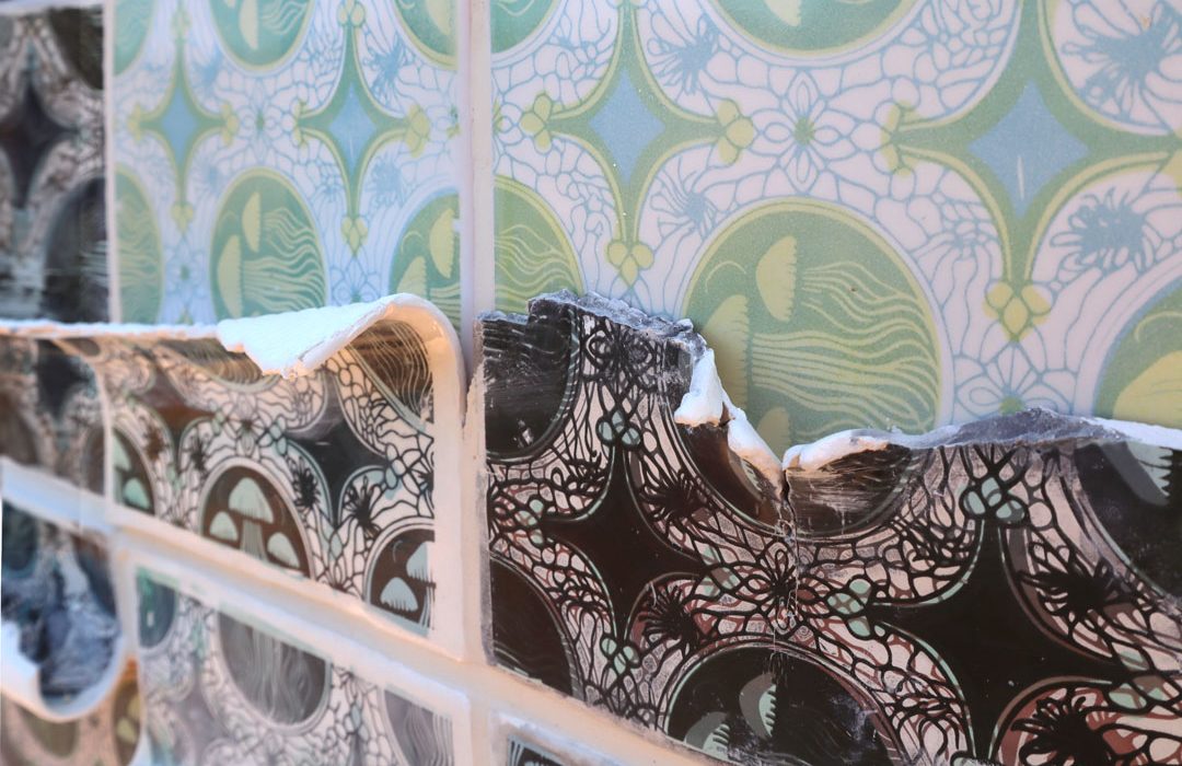 - Media Screenprinted ceramic tiles, grout, and cement on welded scrap steel frame
