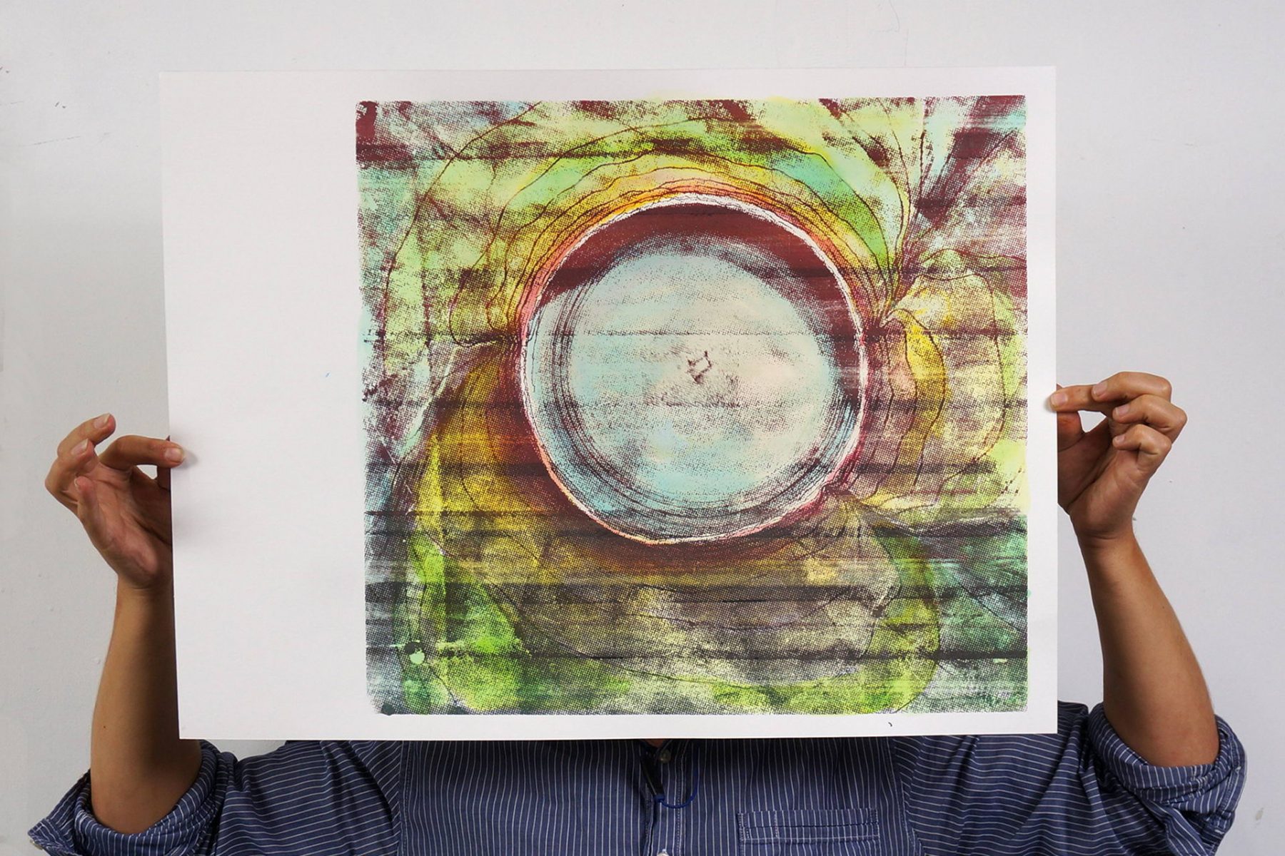 These studies started by holding a stationary pen against paper that was rotated by a record player, inverting a basic relationship of the drawing process. In this realm, lines become curves, time becomes a loop, and circles take on a special importance. This series combines this drawing technique with screen printing, sewing, and painting, many materials are combined to create a collection of landscapes made entirely of loops, cycles, and circles.