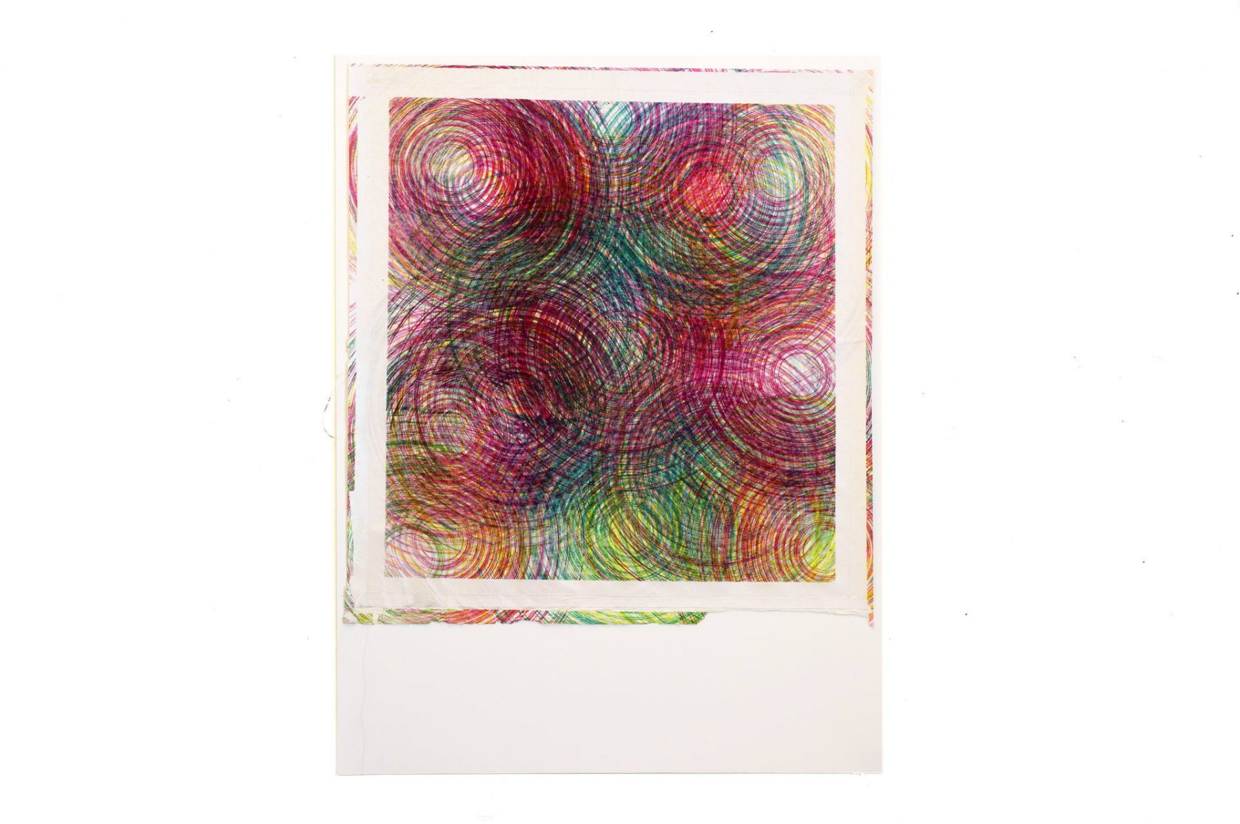 These studies started by holding a stationary pen against paper that was rotated by a record player, inverting a basic relationship of the drawing process. In this realm, lines become curves, time becomes a loop, and circles take on a special importance. My new collection combines this drawing technique with screen printing, sewing, and painting, many materials are combined to create a collection of landscapes made entirely of loops, cycles, and circles.