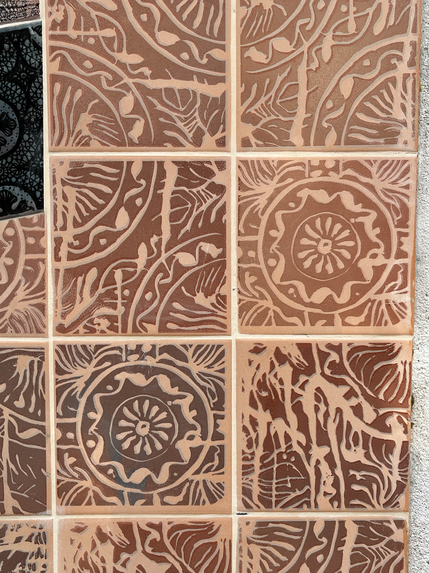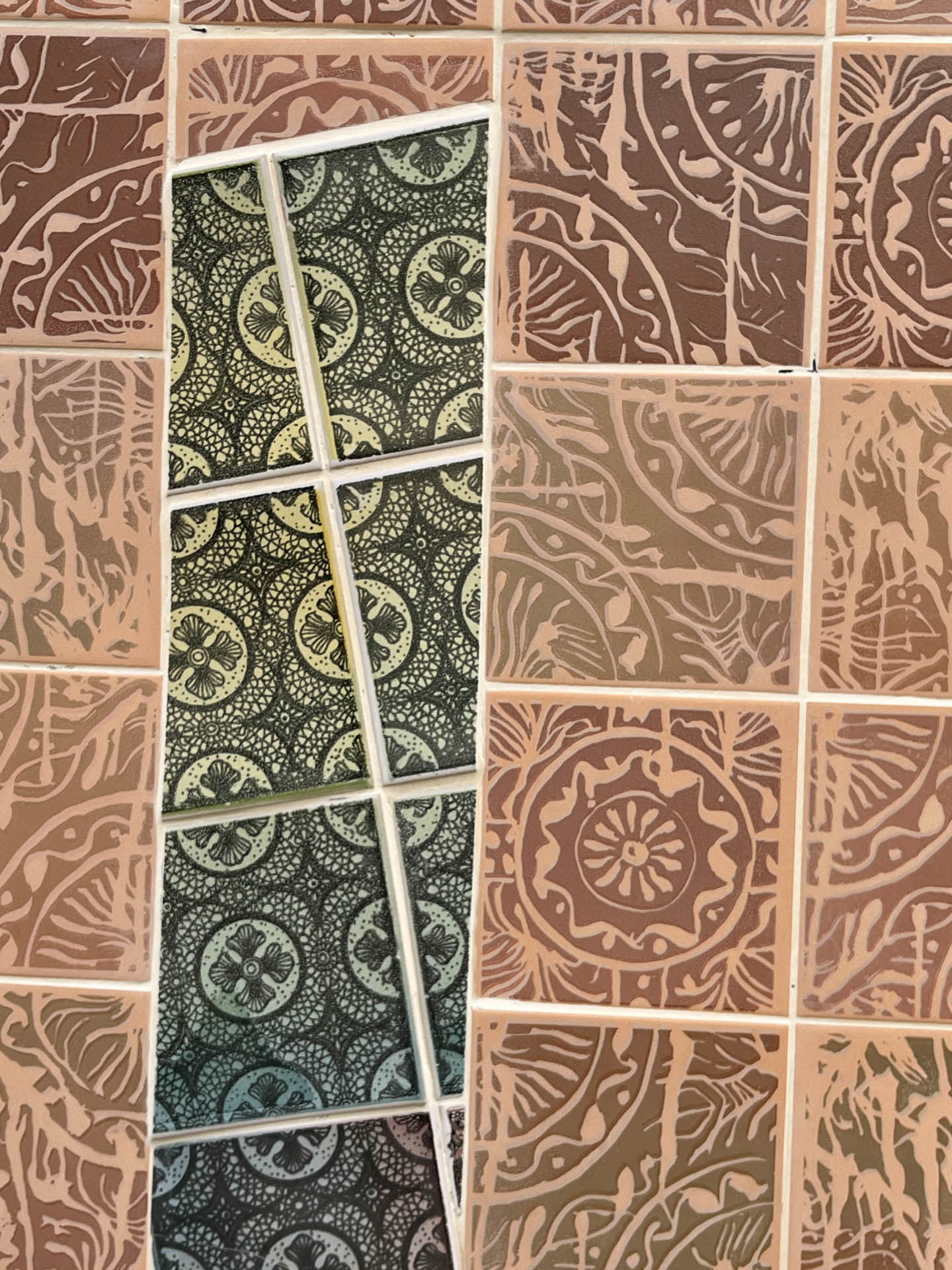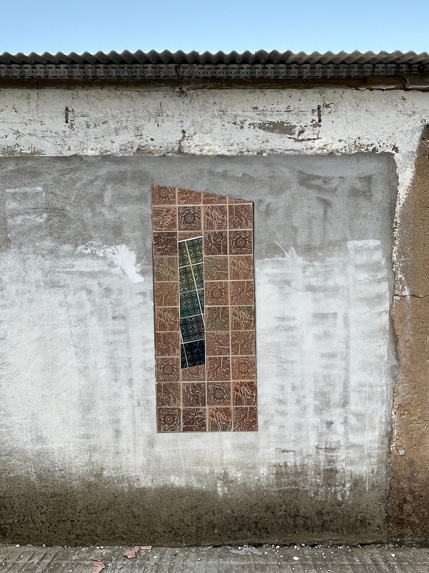 As a May-July 2024 Artist in Residence at Aviário Studio in Ferreira do Zêzere, Portugal, I focused on researching and experimenting with screen printing on ceramic tiles. Over the course of my residency, I developed techniques that resulted in a 100-meter-long permanent installation along the exterior wall of the studio. Using more than 500 hand-printed tiles, I created a series of pieces that explore various tones, patterns, and geometric designs.